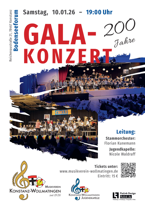 Der Musikverein Konstanz-Wollmatingen 1826 e.V. startet feierlich in sein Jubiläumsjahr:Am Samstag, 10. Januar 2026, um 19:00 Uhr laden Sie herzlich ins Bodenseeforum Konstanz zum großen Gala-Doppel-Konzert mit